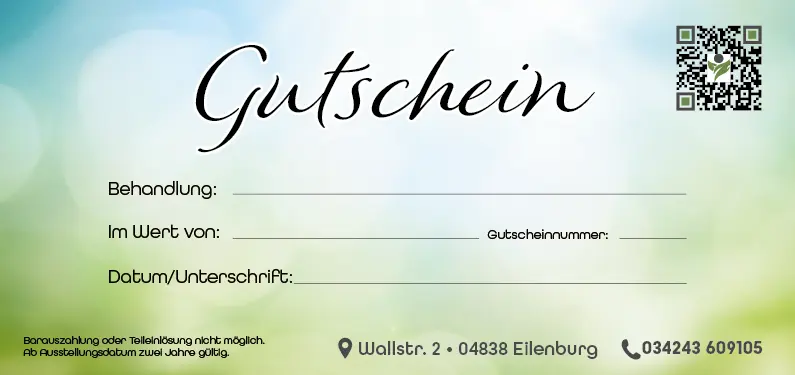 Sie können Ihren personalisierten Gutschein gerne nach vorheriger telefonischer Absprache während unserer Öffnungszeiten direkt in unserer Praxis abholen. Wir freuen uns darauf, Ihnen das ideale Geschenk zu gestalten!